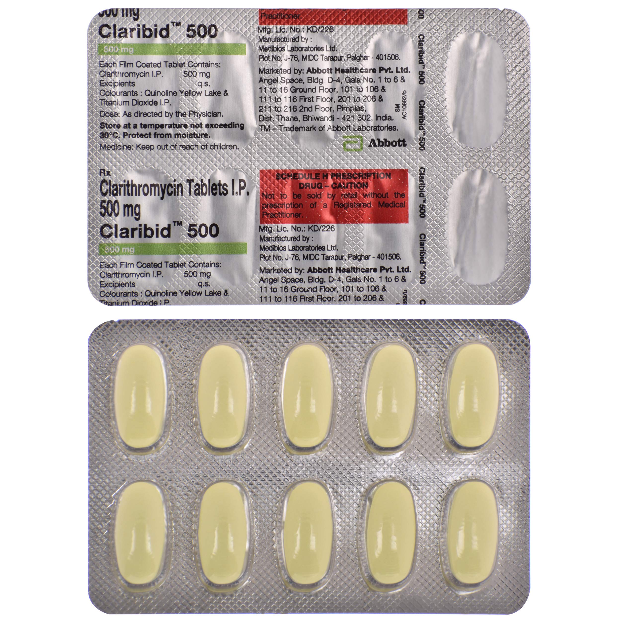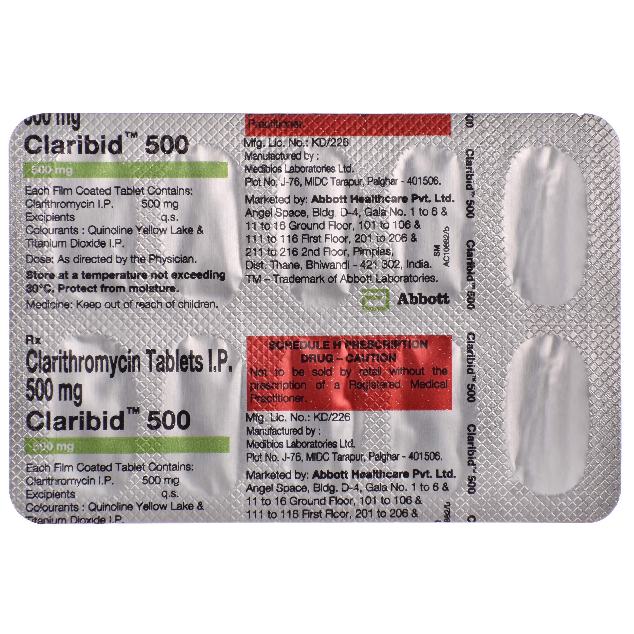Claribid 500 Tablet is a broad-spectrum antibiotic commonly prescribed to treat a wide range of bacterial infections. It is particularly effective for respiratory tract infections, as well as infections of the ears, sinuses, throat, lungs, and skin. Additionally, it is used in the treatment of infections caused by Helicobacter pylori, which is associated with peptic ulcer disease. In immunocompromised individuals, Claribid is also useful against certain opportunistic infections like Mycobacterium avium complex (MAC). The medication works by inhibiting bacterial protein synthesis, thereby preventing the growth and multiplication of bacteria, ultimately helping the body eliminate the infection. It is recommended to take this medicine orally, ideally one hour before or two hours after meals, for optimal absorption. Avoid consuming antacids within two hours of taking the tablet, as this may interfere with its effectiveness. It is important to take the medication consistently at the same time every day and to complete the full course prescribed, even if symptoms improve earlier, to prevent recurrence or resistance. Common side effects may include abdominal discomfort, nausea, diarrhea, vomiting, headache, altered taste sensation, rash, or elevated liver enzymes. These effects are usually temporary and mild, but any persistent or severe symptoms should be reported to a healthcare provider. Before starting this medication, inform your doctor if you have any known allergies, heart conditions, kidney or liver issues, or if you are pregnant or breastfeeding. Alcohol consumption should be avoided during treatment as it may worsen drowsiness or dizziness. If you forget to take a dose, take it as soon as you remember. If your next dose is near, skip the missed one and continue with your regular schedule—never double the dose. Claribid 500 may impair alertness or coordination in some people, so caution is advised when driving or operating machinery. Always follow your doctor’s instructions closely to ensure safe and effective treatment.