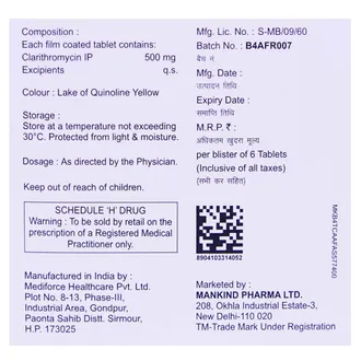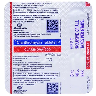 CLARINOVA 500MG Tablet is a broad-spectrum antibiotic used to treat a wide range of bacterial infections. It belongs to the macrolide class and works by stopping the growth of bacteria responsible for infections in the lungs, throat, skin, sinuses, and ears. It is also prescribed in combination with other medicines to treat certain stomach ulcers caused by Helicobacter pylori. This medicine helps relieve symptoms such as fever, sore throat, cough, and discomfort while promoting faster recovery.
