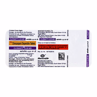 Clonafit 0.25mg Tablet is a prescription medicine primarily used to manage anxiety, panic disorders, and certain seizure disorders. It contains Clonazepam, a benzodiazepine that works by calming abnormal electrical activity in the brain, helping to control seizures and reduce anxiety.