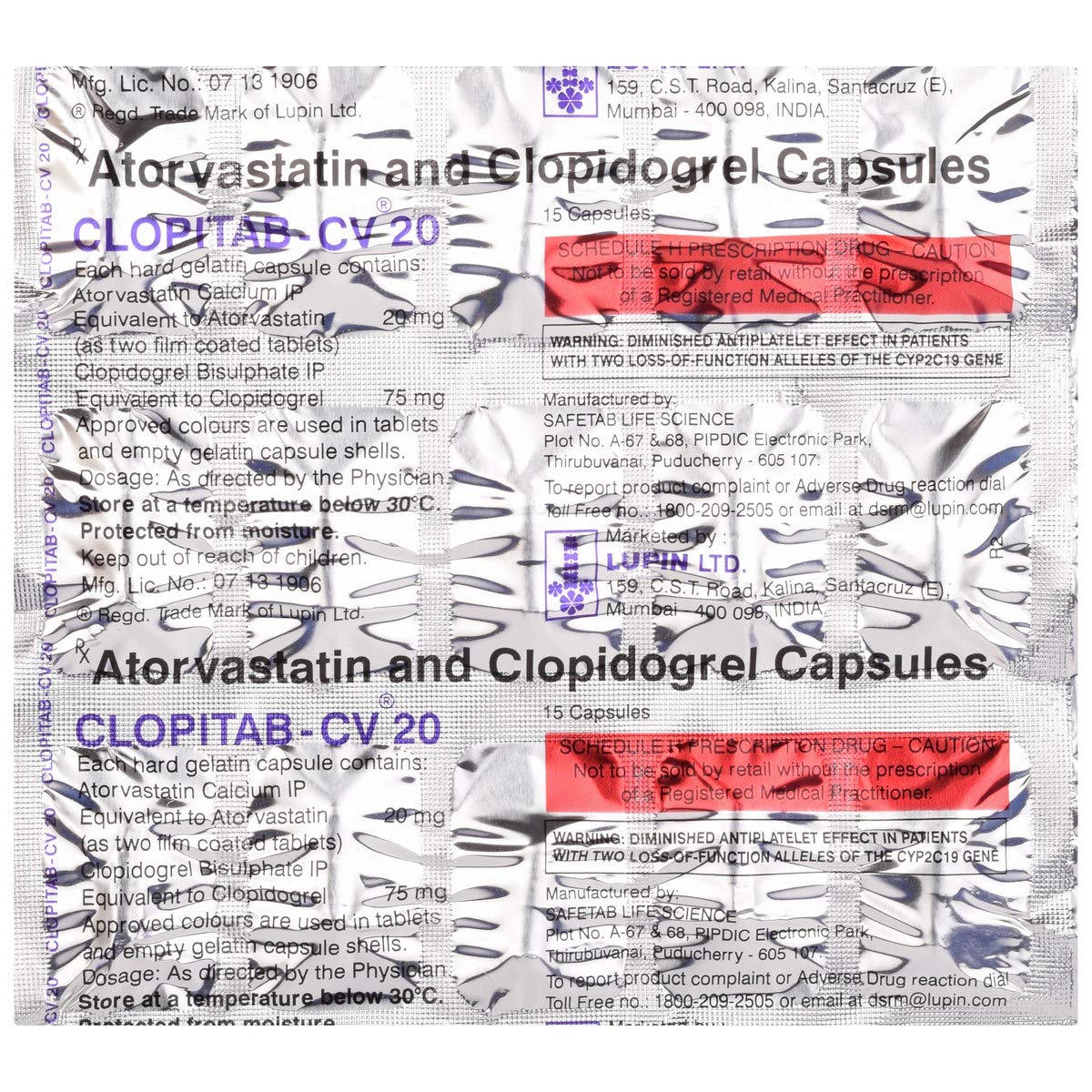 Clopitab-CV 20 Capsule is a combination medicine commonly prescribed to safeguard the heart and blood vessels. It works by lowering unhealthy cholesterol levels and preventing blood clots, thereby reducing the chances of stroke and heart attack. With regular use, it helps improve overall cardiovascular function and long-term heart health.