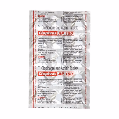 Clopivas AP 150 Tablet combines Clopidogrel, which prevents platelets from sticking together, with Aspirin, which inhibits substances that trigger clotting. This dual action reduces the risk of blood clot formation, ensures smoother blood flow, and protects the heart and brain from potential blockages.