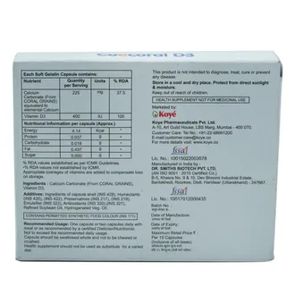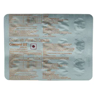 Coecoral D3 Capsule is a dietary supplement that helps with bone and teeth health and makes them stronger. Calcium is used to prevent low blood calcium levels in individuals who do not get enough calcium from their diets. Calcium is important for the growth and development of bones. Vitamin D3 is used to absorb calcium in the blood. Vitamin D3 helps process essential minerals in the body, like calcium and phosphorus. Lack of vitamin D3 results in bone weakening, bone pain, and skin conditions.