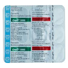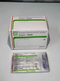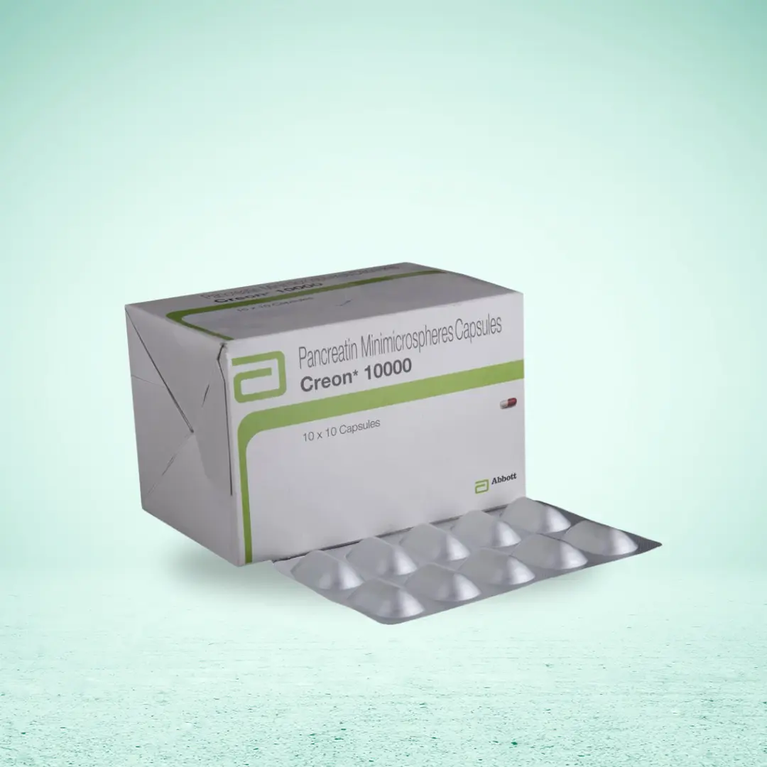 Creon 10000 Capsule is a medication used to manage pancreatic enzyme insufficiency, a condition where the body does not produce enough enzymes for proper digestion. This supplement contains digestive enzymes that assist in breaking down fats, proteins, and carbohydrates, improving nutrient absorption and easing digestive discomfort. It helps reduce the frequency of loose stools and relieves symptoms such as bloating and stomach pain.