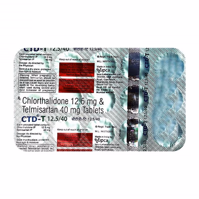CTD-T 12.5/40 Tablet contains Telmisartan, an angiotensin receptor blocker that relaxes blood vessels, and Chlorthalidone, a diuretic that helps eliminate excess salt and water from the body. Together, they reduce blood pressure effectively and maintain a healthy heart function.