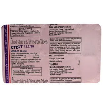CTD-T 12.5/80 Tablet contains Telmisartan, which relaxes blood vessels by blocking angiotensin, and Chlorthalidone, a diuretic that removes excess salt and water from the body. Together, they effectively reduce blood pressure and improve heart and kidney function.