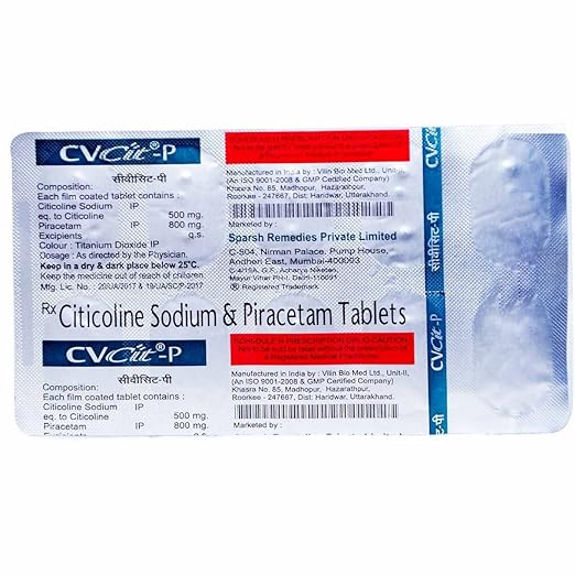 CVcit-P Tablet is used to support stroke rehabilitation and improve cognitive function. It helps protect nerve cells in the brain from damage and aids in repairing injured nerve cells. It may also be used in cases of brain trauma. The tablet contains Citicoline, which nourishes and protects nerve cells, and Piracetam, which supports brain function and protects against oxygen deprivation in the nervous system. CVcit-P Tablet can be taken with or without food, preferably at the same time each day, and should be used exactly as prescribed by your doctor. Do not stop the medication suddenly, and complete the full course even if symptoms improve. Common side effects may include weight gain, hyperactivity, stomach pain, nervousness, diarrhea, dizziness, decreased blood pressure, and uncoordinated movements, which usually resolve over time. Drink plenty of fluids to stay hydrated and maintain a balanced diet and exercise routine to manage weight. Use with caution in patients with kidney or liver conditions, and consult your doctor about alcohol consumption, pregnancy, breastfeeding, or driving while on this medication. If a dose is missed, take it as soon as possible unless it is near the time for your next dose; do not double the dose. CVcit-P Tablet supports brain recovery, reduces damage from stroke, and enhances overall neurological health.