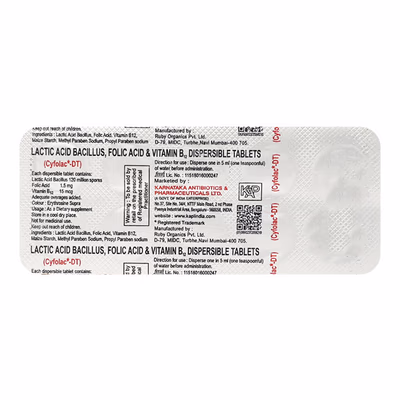 Cyfolac-DT Tablet is a unique combination of Lactic Acid Bacillus, Folic Acid, and Vitamin B12 formulated to promote digestive balance, nutritional wellness, and overall vitality. This supplement helps maintain a healthy gut environment, supports nutrient absorption, and contributes to energy production. It is designed for both men and women who wish to maintain healthy metabolism and digestive function as part of their daily routine.
