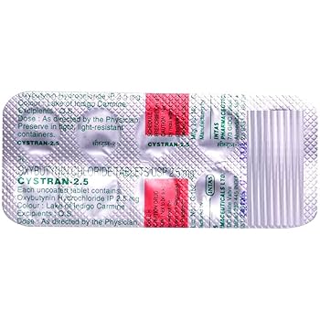 Cystran 2.5 Tablet is prescribed for managing symptoms of an overactive bladder. It helps control issues like frequent urination, sudden strong urges to urinate, and difficulty in controlling the bladder.