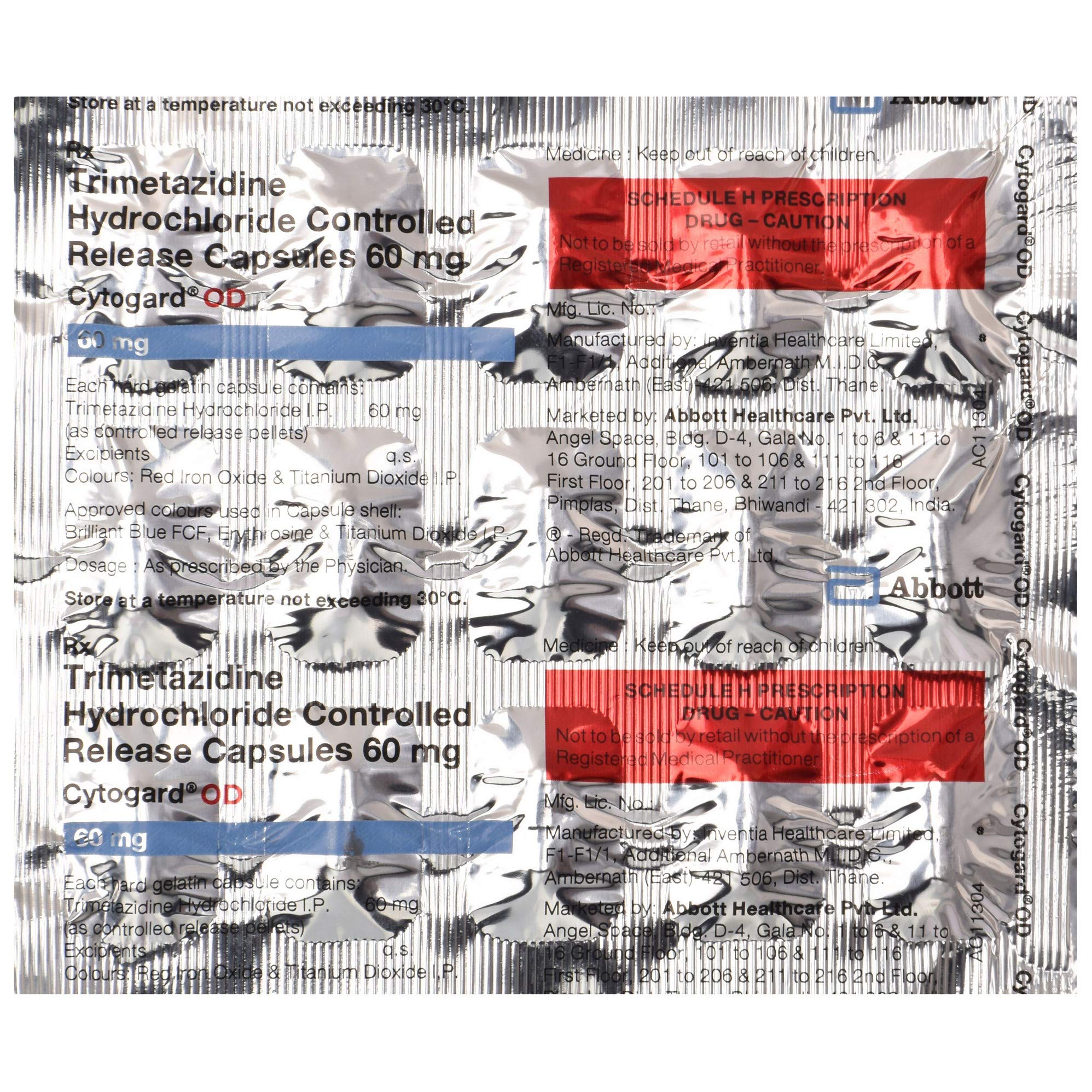Cytogard OD Capsule CR is not suitable for treating sudden chest pain (acute angina). It is contraindicated in patients with Parkinson’s disease, movement disorders, or severe kidney impairment. Avoid driving or operating machinery if you feel dizzy or unsteady while using this medication. Always inform your physician about any other health conditions or medications you are taking.