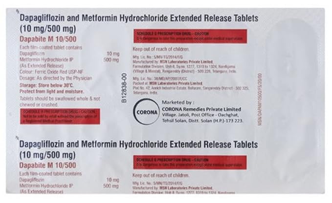 Dapabite M 10mg/500mg Tablet ER is a combination medicine prescribed for people with type 2 diabetes mellitus. It works to keep blood sugar levels under control, which helps lower the risk of long-term complications and offers protection against heart-related problems.