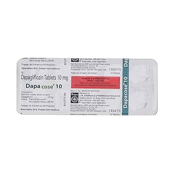 Dapacose 10 Tablet is an effective oral antidiabetic medicine primarily used for managing type two diabetes mellitus. Its active ingredient, dapagliflozin ten milligram, belongs to the class of SGLT2 inhibitors. It works by promoting the excretion of excess glucose through urine, thereby lowering blood sugar levels. Dapacose 10 Tablet is often prescribed to adults whose blood sugar is not adequately controlled by diet, exercise, or other antidiabetic medications. Regular use of this medicine helps reduce fasting and post-meal glucose, supports weight management, and decreases the risk of long-term complications associated with diabetes such as heart, kidney, and nerve disorders. The tablet should be taken under medical supervision, combined with a balanced diet and regular exercise, and the full course should be followed to maintain steady glucose control.