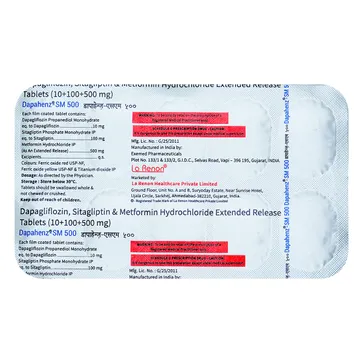 Dapahenz-SM 500 Tablet ER is a combination oral medicine formulated for the management of type two diabetes mellitus. It contains dapagliflozin and metformin in an extended release formulation, designed to provide effective and sustained blood sugar control. Dapagliflozin, an SGLT2 inhibitor, promotes glucose excretion through urine, while metformin reduces hepatic glucose production and improves insulin sensitivity in muscle and fat tissues. The extended release mechanism ensures steady absorption and prolonged action, minimizing fluctuations in blood sugar levels and improving patient adherence. Dapahenz-SM 500 Tablet ER is particularly suitable for patients whose diabetes is not adequately controlled by diet, exercise, or single-drug therapy. When used alongside a balanced diet and regular physical activity, it helps prevent long-term complications such as cardiovascular, renal, and nerve disorders, supporting overall metabolic health and well-being.