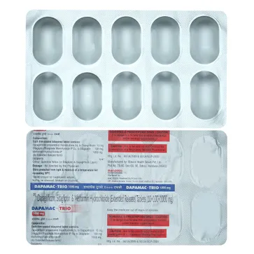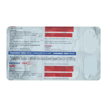DAPAMAC TRIO 1000 mg Tablet is an advanced antidiabetic medicine designed for adults with type two diabetes mellitus who require stronger glucose-lowering therapy. It is a triple combination of Dapagliflozin, Teneligliptin, and Metformin, which work synergistically to maintain effective and sustained blood sugar control. Dapagliflozin reduces excess glucose by eliminating it through urine, Teneligliptin improves insulin release by blocking the DPP-4 enzyme, and Metformin decreases glucose production in the liver while enhancing insulin sensitivity. This combined action provides better glycemic management than single or dual therapies. Regular use of this medicine not only controls sugar levels but also reduces the risk of long-term complications such as heart disease, kidney issues, nerve weakness, and eye damage. When combined with lifestyle changes including balanced diet and regular exercise, DAPAMAC TRIO 1000 mg helps improve overall health, energy levels, and long-term quality of life in diabetic patients.