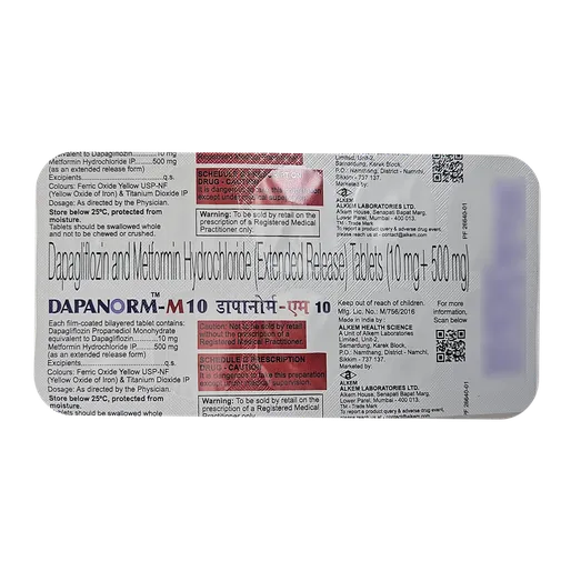 Dapanorm-M 10 Tablet ER is a combination medication used to manage blood sugar levels in people with type 2 diabetes mellitus. It helps to lower elevated blood glucose, reducing the risk of serious diabetes-related complications, including heart disease. This medicine should be taken with food at the same time each day to maintain consistent blood levels and improve effectiveness. The dosage and duration will be determined by your healthcare provider, and it is important not to stop the treatment without medical advice, as doing so may lead to increased blood sugar and raise the risk of complications such as kidney damage and vision problems. This medication is part of a comprehensive diabetes management plan that includes a healthy diet, regular physical activity, and weight control as recommended by your doctor.