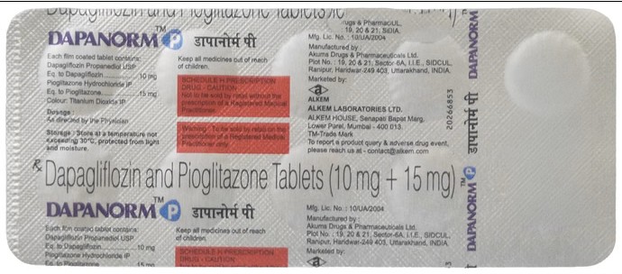 Dapanorm P 10mg/15mg Tablet contains dapagliflozin and pioglitazone. Dapagliflozin works as an SGLT2 inhibitor, preventing the kidneys from reabsorbing glucose, which helps eliminate excess sugar through urine. Pioglitazone enhances the body’s response to insulin and helps reduce insulin resistance at the cellular level. Together, these actions provide a comprehensive approach to managing blood sugar levels.