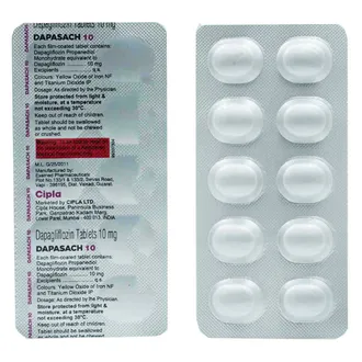 Dapasach 10 mg Tablet is an antidiabetic medicine used either alone or in combination with other drugs to manage type 2 diabetes. It helps lower elevated blood sugar levels, reducing the risk of serious complications associated with diabetes such as kidney problems, nerve damage, and heart disease.