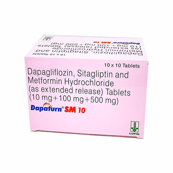 Dapaturn SM 10 Tablet ER is a combination medicine used for the treatment of type 2 diabetes mellitus. It contains Dapagliflozin, Metformin, and Sitagliptin in an extended-release form, which ensures long-lasting blood sugar control. Dapagliflozin lowers glucose levels by helping the kidneys remove extra sugar through urine, Metformin reduces sugar production in the liver and increases the body’s sensitivity to insulin, while Sitagliptin improves the release of insulin and decreases excess glucose made by the body. Together, these actions help maintain stable blood sugar levels throughout the day when combined with a proper diet and regular physical activity.