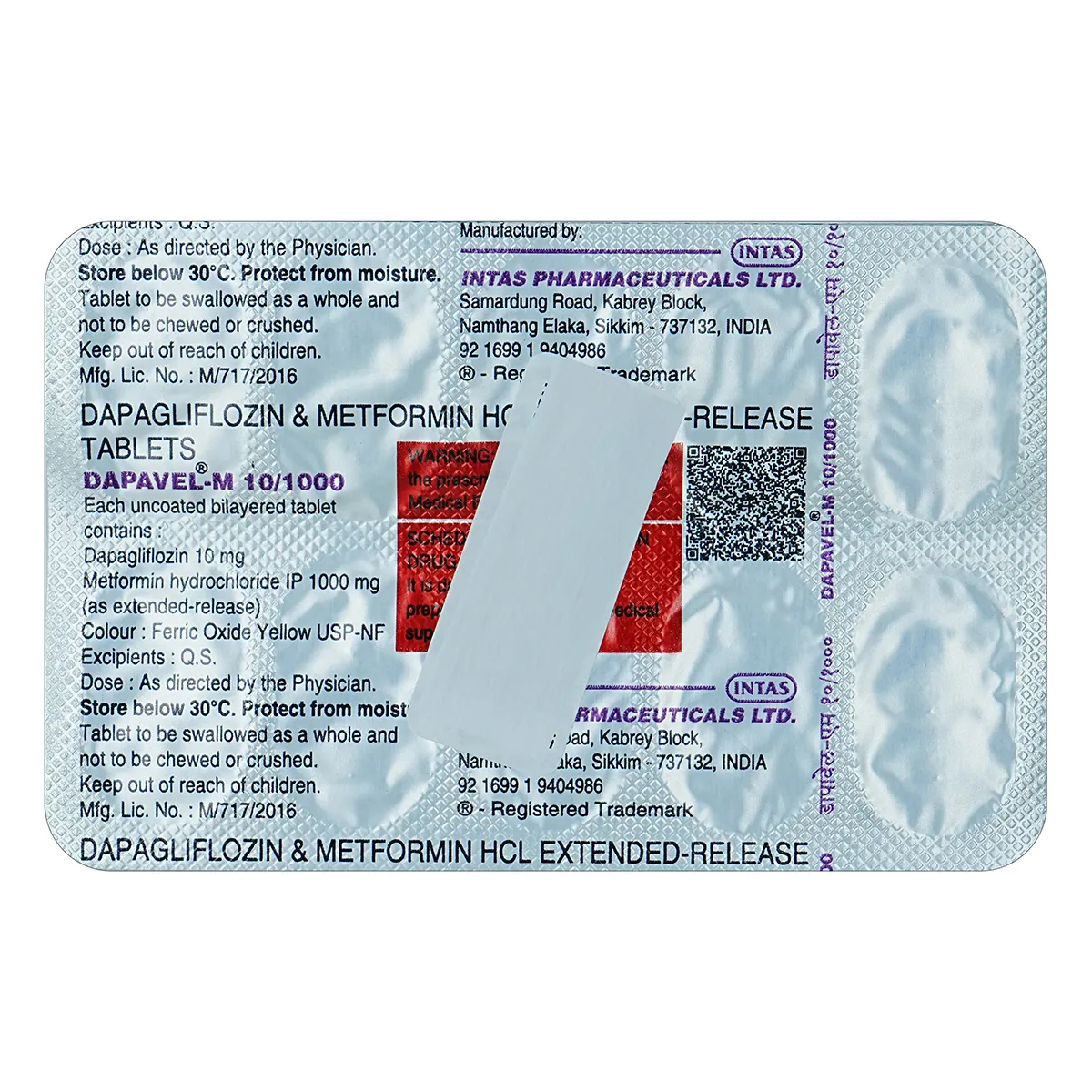 Dapavel LM 1000 Tablet is an antidiabetic medicine used to manage Type 2 Diabetes Mellitus. It helps control blood sugar levels and lowers the risk of diabetes-related complications such as kidney problems, nerve damage, and vision issues.