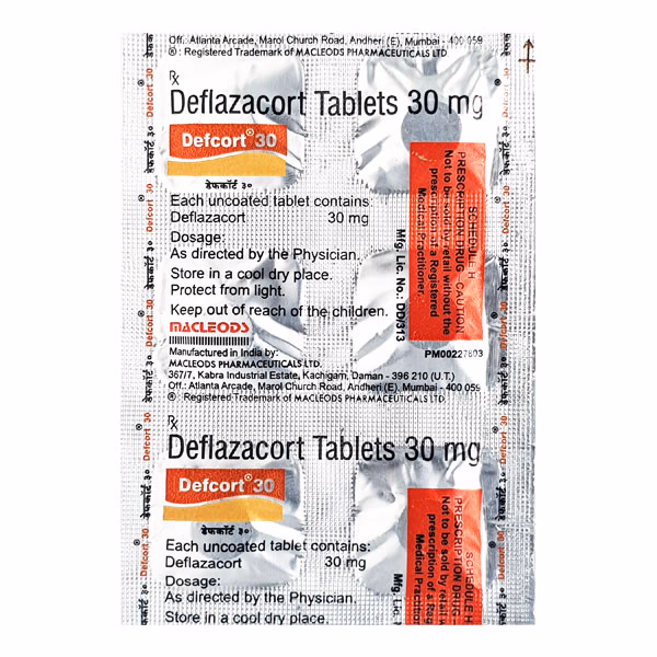 Defcort 30 Tablet is a prescription medicine that contains deflazacort, a corticosteroid used to manage inflammation, allergies, autoimmune conditions, and certain muscular disorders. It is prescribed for conditions such as asthma, arthritis, chronic obstructive pulmonary disease, skin allergies, severe eye problems, blood disorders, kidney diseases like nephrotic syndrome, and autoimmune diseases including lupus. In addition, it is also used in patients with Duchenne muscular dystrophy to improve muscle strength and delay progression of weakness. Defcort 30 Tablet works by suppressing the body’s immune response and blocking substances that cause swelling, redness, and irritation. This helps relieve symptoms like pain, stiffness, wheezing, and allergic flare-ups. Since it is a higher-strength corticosteroid, its use requires strict medical supervision. It should not be stopped suddenly, as tapering is necessary to avoid withdrawal complications. Regular monitoring is essential during prolonged treatment.