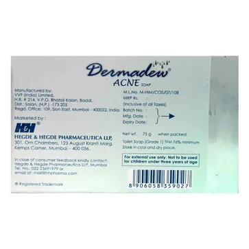 Dermadew Acne Soap is a specially formulated medicated cleansing bar designed for individuals dealing with acne-prone and oily skin. It combines gentle cleansing agents with antibacterial and skin-purifying ingredients that help reduce acne breakouts, control excess oil, and maintain the natural balance of the skin. This soap works by effectively removing dirt, oil, and impurities that clog pores while ensuring the skin remains soft, smooth, and hydrated. It also reduces skin irritation and redness associated with acne, making it suitable for daily use. Regular application of Dermadew Acne Soap can help prevent pimples, blackheads, and whiteheads while also supporting clearer and healthier skin over time. With its dermatologically tested formulation, this soap is a preferred choice for maintaining proper skin hygiene and promoting long-term acne management without causing harsh dryness.