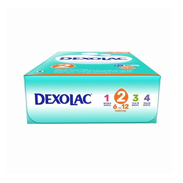 Dexolac 2 Follow-Up Formula is a specially formulated milk-based nutritional supplement designed for infants from six months to one year of age. It provides complete and balanced nutrition to support healthy growth, weight gain, and overall development during this critical stage of life. Enriched with high-quality proteins, essential fatty acids, vitamins, and minerals, it promotes strong bones, improved immunity, and healthy brain and vision development. The formula also contains prebiotics that aid in digestion and maintain a healthy gut, making it gentle on the baby’s stomach. Dexolac 2 is intended for use alongside a balanced diet of solid foods, bridging nutritional gaps and ensuring infants receive all essential nutrients required for energy, vitality, and cognitive growth. With easy preparation and superior digestibility, this follow-up formula ensures steady growth and supports the overall physical and mental development of babies.