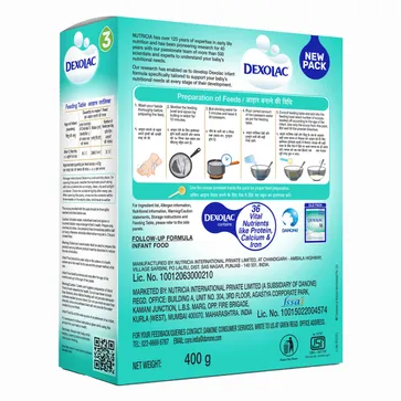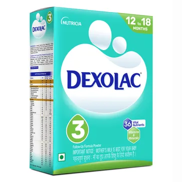 Dexolac 3 Follow-Up Formula is a nutritionally advanced milk-based supplement designed for toddlers from one year onwards. It provides comprehensive nutrition to support continued growth, brain development, and overall health during the crucial early childhood years. The formula is enriched with high-quality proteins, essential fatty acids, vitamins, and minerals that help strengthen bones, enhance immunity, and support cognitive and visual development. Prebiotics are included to promote healthy digestion and maintain gut health. Dexolac 3 is intended to complement a balanced diet of solid foods, ensuring toddlers receive all necessary nutrients for energy, vitality, and healthy development. Gentle on the stomach and easy to digest, this follow-up formula helps toddlers transition smoothly from stage 2 nutrition while supporting proper weight gain, muscle growth, and overall physical and mental well-being.