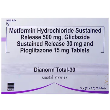 Dianorm Total thirty tablet is a combination oral anti-diabetic medication formulated to manage type two diabetes mellitus effectively. It combines the benefits of metformin and a sulfonylurea to provide comprehensive blood sugar control. The extended-release formulation ensures steady absorption throughout the day, reducing sudden spikes and dips in glucose levels. By enhancing insulin sensitivity and stimulating insulin release from the pancreas, Dianorm Total thirty helps improve overall glucose metabolism and maintain stable blood sugar levels. When used alongside a balanced diet, regular physical activity, and under medical supervision, it can help prevent long-term complications associated with diabetes, including kidney issues, nerve damage, vision problems, and cardiovascular concerns. Its once-daily dosing provides convenience, promotes adherence, and supports better overall management of diabetes, improving the quality of life for adults.