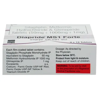 Diapride MS 1 Forte Tablet is a combination of three medicines used to manage type 2 diabetes mellitus. It is recommended when lifestyle changes such as diet and exercise, along with other medicines, are not enough to control blood sugar levels effectively.