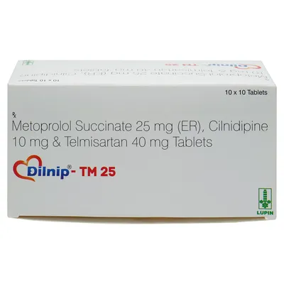 Dilnip TM 10mg/25mg/40mg Tablet ER is a triple-combination medicine formulated to control high blood pressure and protect the heart. It contains Cilnidipine, a calcium channel blocker that relaxes blood vessels; Metoprolol, a beta-blocker that lowers heart rate and reduces the heart’s workload; and Telmisartan, an angiotensin receptor blocker that prevents vessel tightening. The extended-release form ensures steady control of blood pressure throughout the day, lowering the risk of complications like stroke, heart attack, and kidney damage.