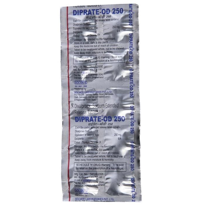 Diprate-OD 250 Tablet ER is a carefully designed extended-release medication used for managing neurological and psychiatric conditions including epilepsy, seizures, bipolar disorder, mania, trigeminal neuralgia, and migraines. It works by regulating overactive nerve activity in the brain, helping to maintain stable electrical signals and balanced neurotransmitters. The medicine can be used alone or alongside other therapies, with dosage and timing customized by a healthcare professional. Consistent daily intake at the same time ensures optimal control of symptoms, and it is important not to stop treatment abruptly. The effects typically become noticeable over several weeks, so continued use as prescribed is essential for safety and effectiveness. Monitoring by a doctor is recommended to prevent complications, manage side effects, and ensure the medicine is working appropriately.