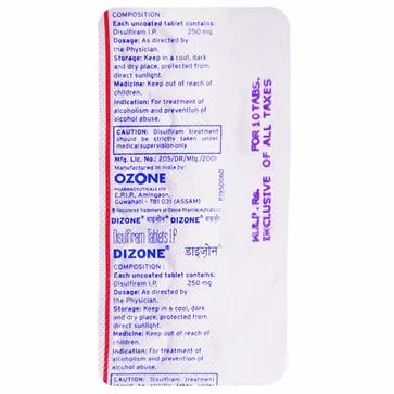 DIZone Tablet is a prescription medicine that plays an important role in the management of alcohol dependence. It works by creating an aversive reaction when alcohol is consumed, producing unpleasant sensations such as nausea, flushing, headache, and dizziness. This mechanism helps patients refrain from drinking, making it an effective aid when combined with counseling and social support. The medicine may be taken with or without food but should always be consumed under medical guidance. It supports individuals who are committed to overcoming alcohol addiction by reducing the urge to drink and helping them build long-term abstinence. Patients must remember that the treatment journey requires not only medication but also determination, therapy, and a supportive environment to ensure lasting recovery. While taking this medicine, it is essential to avoid all sources of alcohol, including beverages, mouthwash, vinegar, liquid medications, and even certain grooming products that may contain alcohol.