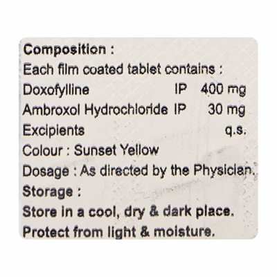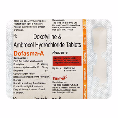 Dofasma A 400mg/30mg Tablet is a prescription medication designed to improve breathing and manage symptoms of chronic lung disorders such as asthma and chronic obstructive pulmonary disease. By relaxing the muscles around the airways and reducing airway obstruction, this tablet helps ease breathing and enhances airflow to the lungs. It also helps thin and loosen mucus in the respiratory tract, making it easier to clear the lungs and reduce coughing episodes. Suitable for adults under medical guidance, Dofasma A Tablet works quickly to relieve tightness in the chest, shortness of breath, wheezing, and other breathing difficulties. Taken with or without food, the dosage and duration are determined by the physician based on individual response and health condition. Regular use ensures optimal symptom management and prevents worsening of respiratory issues. This medication provides reliable relief, supporting patients to maintain daily activities comfortably and safely.