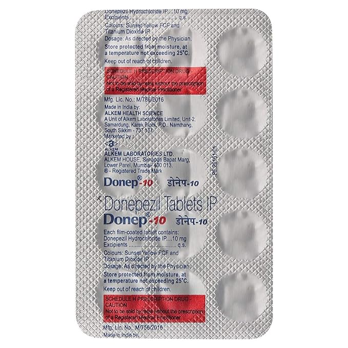 Donep 10 Tablet is a prescription medication designed to manage mild to moderate dementia caused by Alzheimer’s disease. While it does not cure the illness, it supports memory, awareness, and cognitive function by enhancing the communication between nerve cells in the brain. Regular use of Donep 10 Tablet can help patients perform daily activities more effectively and improve overall quality of life. The tablet is typically taken once daily, preferably at night, with or without food, and should be taken consistently at the same time to maintain steady levels in the blood. It may take a few weeks to notice improvements, so ongoing adherence under medical supervision is essential. Your doctor will tailor the dose based on your individual health needs, including kidney or liver function and response to the medicine.