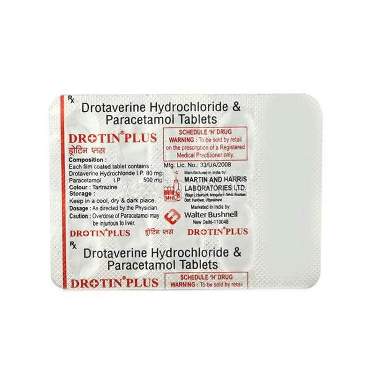Drotin Plus Tablet is a combination medicine used for the treatment of abdominal pain, muscle cramps, and painful periods. It contains Drotaverine Hydrochloride (an antispasmodic) that relaxes smooth muscles and Paracetamol (a pain reliever and fever reducer). Together, they provide quick relief from spasms and pain associated with gastrointestinal, urinary, and gynecological conditions.