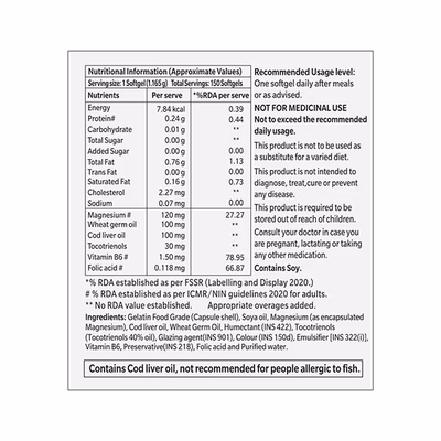 E-Cod Mg® Softgel Capsule works by delivering highly bioavailable magnesium, which helps regulate muscle contractions and relaxations. Magnesium supports neuronal function and calcium balance, reducing the likelihood of cramps and spasms. Tocotrienols and cod liver oil provide antioxidant support to counter oxidative stress in muscle cells. Vitamin B6 and folic acid aid in energy metabolism and cellular function, enhancing recovery and muscular performance.