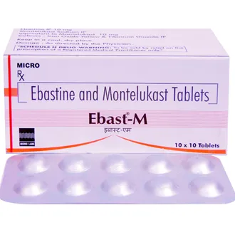 Ebast-M Tablet is used to treat allergic conditions, such as allergic rhinitis (sneezing, runny nose, and itching) and chronic urticaria (hives and itching). This combination medicine contains Ebastine and Montelukast, which work together to provide more effective relief from allergy symptoms, including nasal congestion, sneezing, and itching.