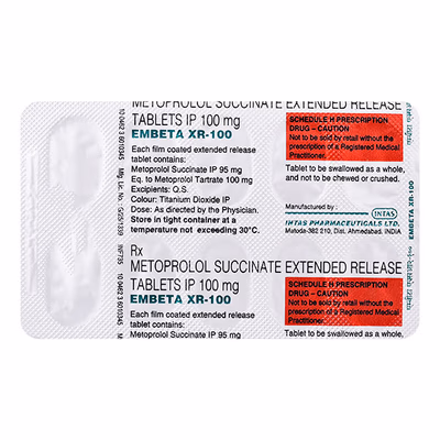 Embeta XR 100 Tablet works as a long-acting beta-blocker that slows the heart rate and helps the heart pump blood more efficiently. This action lowers blood pressure and decreases the strain on the heart. By keeping blood pressure under control, it reduces the chances of serious health issues such as stroke, heart attack, kidney damage, or other cardiovascular complications. For the best results, take this medicine regularly as prescribed and do not stop it without consulting your doctor.