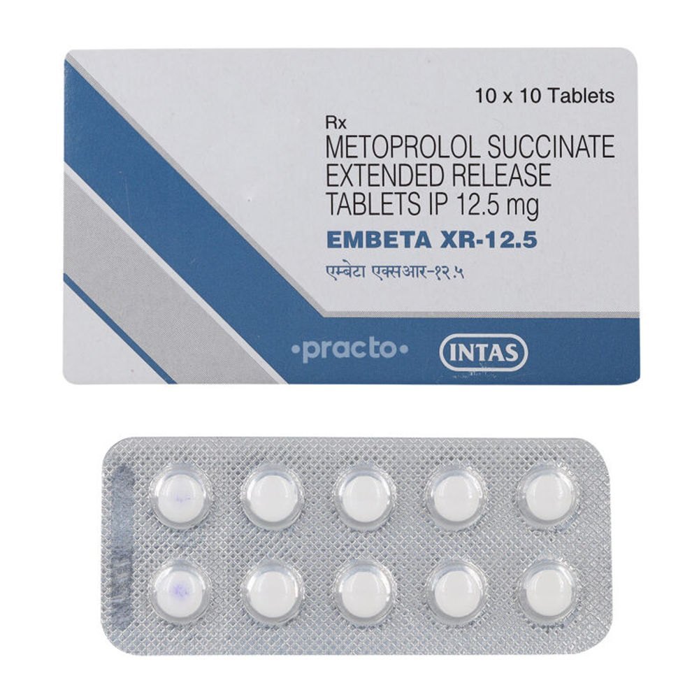 Embeta XR 12.5 Tablet is a medicine that falls under the category of beta-blockers. It is mainly used to manage conditions such as high blood pressure, chest pain caused by heart problems (angina), and irregular heartbeats (arrhythmia). This medication can also help in preventing migraines, future heart attacks, and strokes.