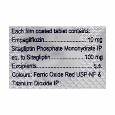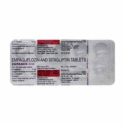 Empaneo-S 10 Tablet contains two active ingredients, empagliflozin and sitagliptin. Empagliflozin works by removing extra sugar from the body through urine, while sitagliptin helps increase insulin production when blood sugar levels rise and decreases sugar production by the liver. Together, they provide better blood sugar control than either medicine alone.