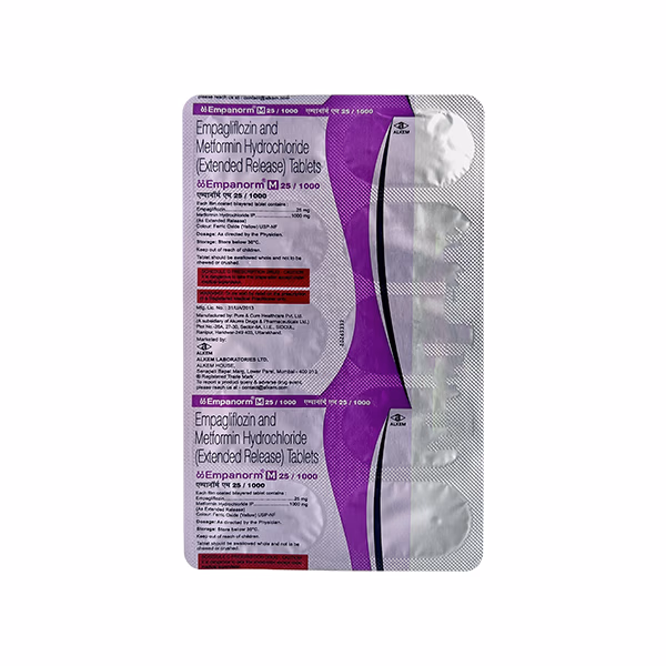 Empanorm M 25mg/1000mg Tablet is a prescription medication used to help manage blood sugar levels in adults diagnosed with type 2 diabetes. It combines two active ingredients—empagliflozin and metformin—which work together to support better glycemic control. This medication is intended to be used alongside lifestyle changes such as a healthy diet and regular physical activity. By improving the way the body uses insulin and facilitating the removal of excess glucose through urine, it helps lower high blood sugar levels.