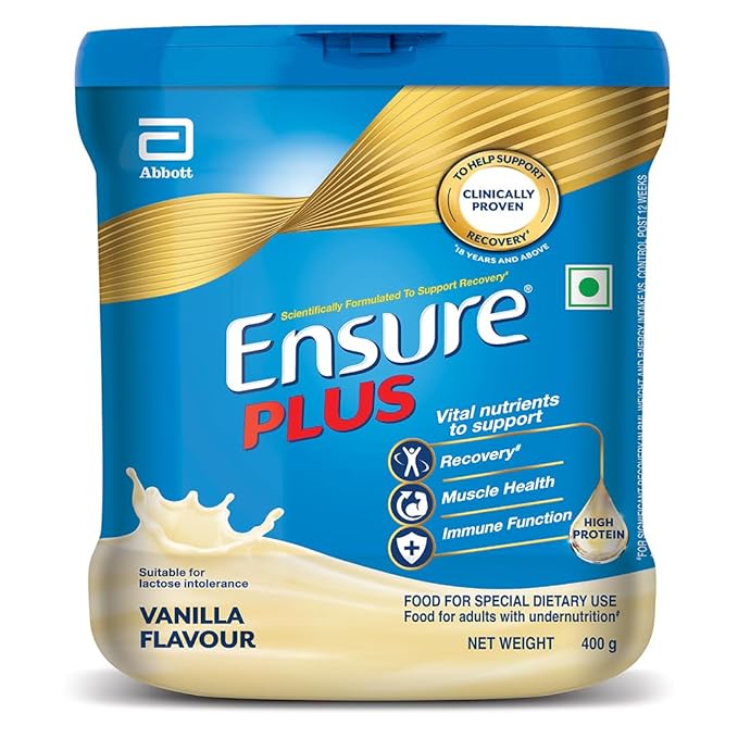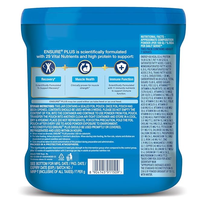 Ensure Plus Powder is a scientifically developed nutritional supplement designed to support recovery and enhance muscle, bone, and immune health. It provides a balanced blend of over 28 essential nutrients, including high-quality proteins such as whey protein concentrate, sodium caseinate, and soy protein isolate, along with energy-rich ingredients like maltodextrin and sucrose. The formula is enriched with healthy fats from high oleic sunflower, soy, and coconut oils, prebiotic fiber (FOS), and HMB (calcium β-hydroxy-β-methyl butyrate) to help maintain muscle strength and aid in physical recovery. Essential vitamins including A, B1, B2, B6, B12, C, D2, E, K, niacin, pantothenic acid, biotin, and choline, along with important minerals such as calcium, phosphorus, magnesium, iron, zinc, copper, iodine, selenium, and others, support overall well-being. With antioxidants like mixed tocopherols and electrolytes such as sodium and potassium chloride, this powder supports immunity, cellular protection, and hydration. Suitable for vegetarians, naturally gluten-free, and appropriate for those with lactose intolerance, Ensure Plus delivers approximately 429 kcal per 100 grams. For best results, mix 8 scoops (around 71.2g) with 190 ml of water to prepare a 240 ml serving. This product contains milk and soy and should only be used by adults unless advised by a healthcare professional. It is not intended for pregnant or breastfeeding women, young children, adolescents, or the elderly without medical guidance. Ensure Plus is not for intravenous use and is unsuitable for individuals with galactosemia.