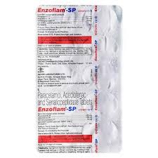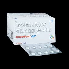 Enzoflam-SP Tablet is a combination medication commonly prescribed to relieve pain, swelling, and inflammation, particularly in joint and muscle-related conditions such as rheumatoid arthritis, osteoarthritis, ankylosing spondylitis, and postoperative discomfort. It contains three active ingredients—Aceclofenac, Paracetamol, and Serratiopeptidase—which work together to reduce pain, inflammation, and promote healing. Aceclofenac and Paracetamol help block chemical messengers in the brain responsible for pain and fever, while Serratiopeptidase aids in breaking down inflammatory proteins to accelerate recovery. This medicine should be taken with food or milk to reduce the risk of stomach upset. Following the prescribed dosage and timing enhances its effectiveness and minimizes potential side effects. Some common side effects may include nausea, vomiting, indigestion, heartburn, stomach pain, dizziness, drowsiness, and changes in liver enzyme levels. Long-term use may require regular monitoring of liver and kidney function. Alcohol should be avoided while taking this medicine due to increased risk of stomach bleeding or liver damage. Use in pregnancy or breastfeeding should be done only under medical supervision. Driving should be avoided if you experience drowsiness or dizziness. If you miss a dose, take it when you remember, but skip it if it’s almost time for the next dose—do not double up. This medication should be used with caution in patients with liver or kidney disorders, and it is generally not recommended in cases of severe impairment.