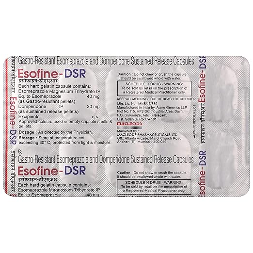 Esofine-DSR Capsule is a combination medicine formulated to manage acid reflux, gastroesophageal reflux disease (GERD), gastritis, and peptic ulcers. It generally contains Esomeprazole (a proton pump inhibitor) and Domperidone (a prokinetic agent). Esomeprazole reduces excess stomach acid production, providing relief from heartburn, acidity, and ulcer-related discomfort, while Domperidone enhances stomach emptying and prevents nausea, bloating, and vomiting. Together, they improve digestion, reduce acid-related irritation, and promote overall comfort. Esofine-DSR Capsule is widely prescribed for people suffering from long-standing acidity, regurgitation, and indigestion, especially when lifestyle changes alone are not sufficient. By controlling acid secretion and enhancing gut motility, this capsule ensures better relief and helps prevent recurrence of symptoms. It should always be taken under medical guidance for safe and effective use.