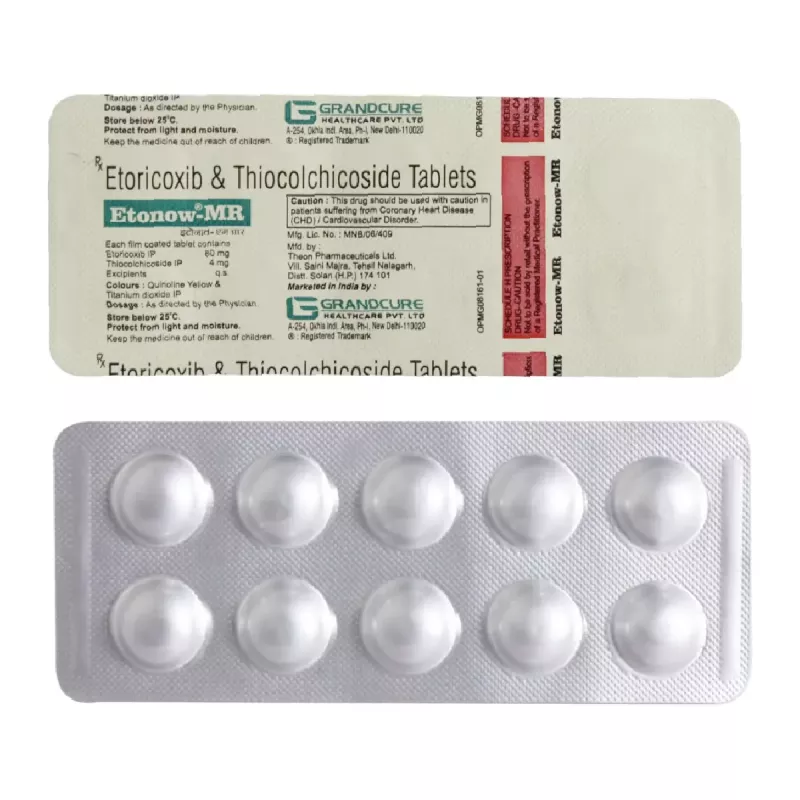 Etonow-MR Tablet contains Etoricoxib and Thiocolchicoside. Etoricoxib, a non-steroidal anti-inflammatory drug (NSAID), works by blocking chemical messengers responsible for pain and inflammation. Thiocolchicoside acts on the central nervous system to relax tight muscles, easing stiffness and promoting better mobility. Together, these ingredients target both pain and muscular tension effectively.