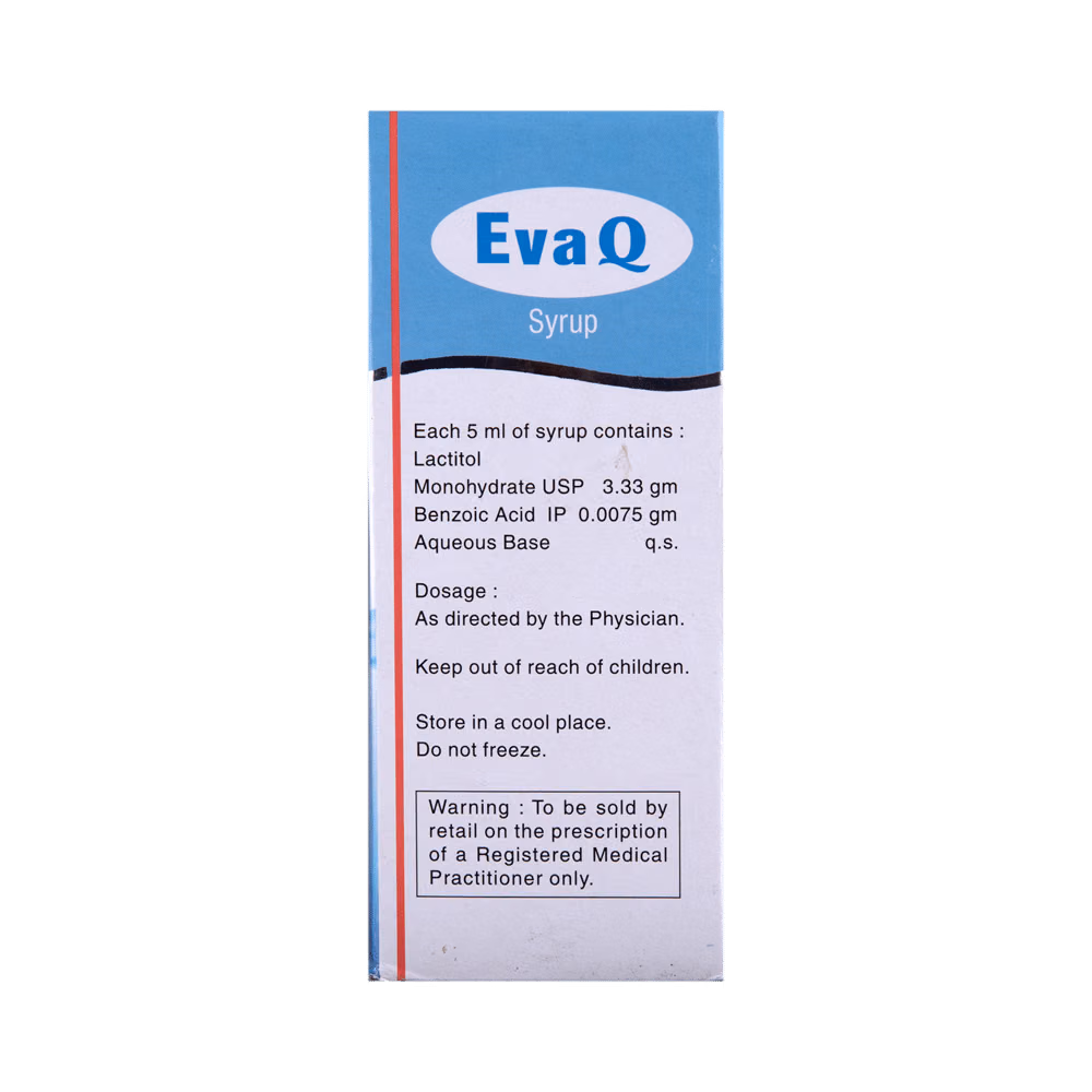 Eva Q Syrup is a laxative solution commonly prescribed to relieve constipation. It works by increasing the water content in the intestines, which softens the stool and makes bowel movement easier. In addition to constipation, it may also be recommended in the management and prevention of hepatic encephalopathy, a condition associated with severe liver problems.