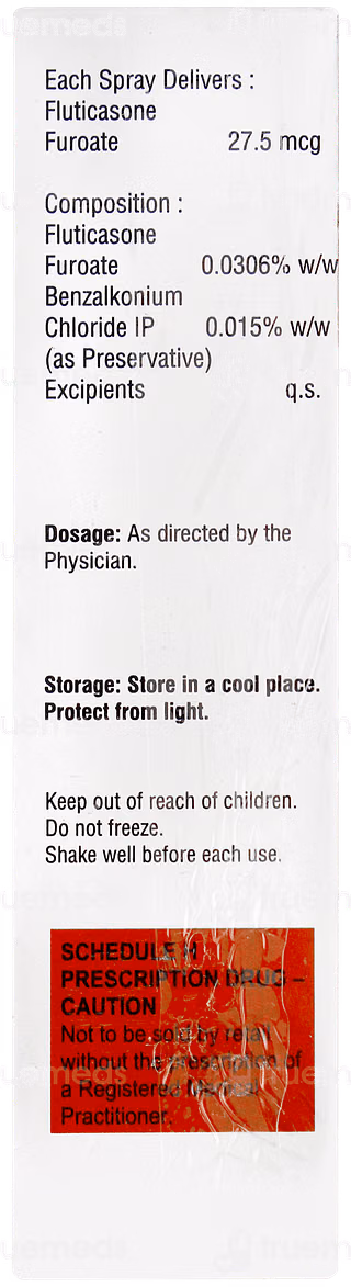 Some individuals may experience mild nasal irritation, burning, or itching after using the spray. Other possible effects include nosebleeds, headache, or nasal inflammation. If these symptoms persist or become bothersome, seek medical advice. Since this medicine may slightly weaken your immune response, avoid close contact with people who have infections like measles, chickenpox, or tuberculosis. It’s also advisable to stay away from triggers like dust, pollen, or smoke that can worsen your condition.