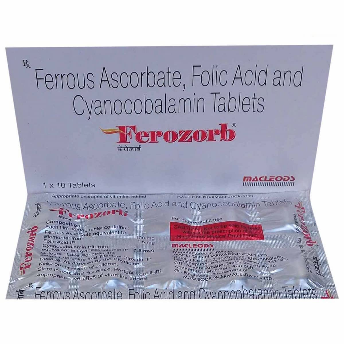 Ferozorb Tablet is a dietary supplement formulated with ferrous ascorbate (iron), folic acid (vitamin B9), and cyanocobalamin (vitamin B12) to support healthy red blood cell production and prevent anemia. This tablet enhances oxygen transport, boosts energy levels, and maintains overall vitality. It is suitable for adults who need to replenish iron and B-vitamin stores due to low dietary intake or chronic blood loss.