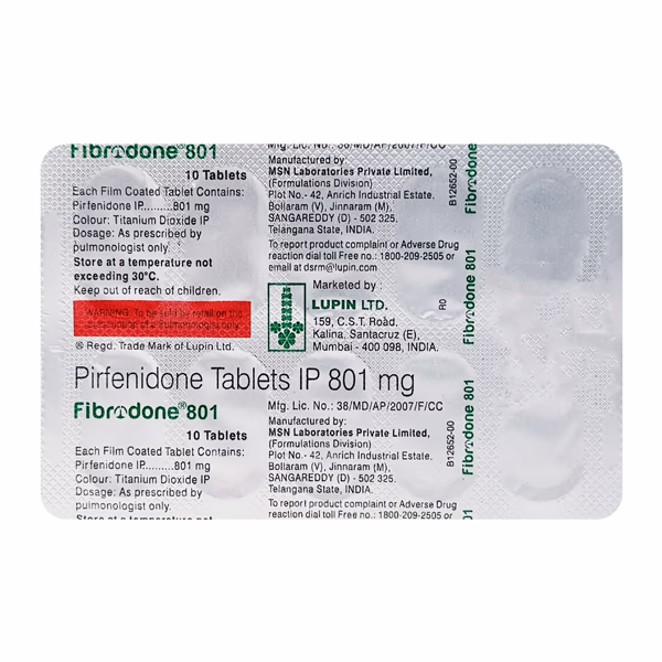 Fibrodone 801mg Tablet is a prescription antifibrotic medication designed for the management of idiopathic pulmonary fibrosis (IPF), a chronic lung condition characterized by scarring and stiffness of lung tissue. By reducing fibrosis and inflammation, this tablet supports improved lung function, helping patients breathe more comfortably and manage symptoms effectively.