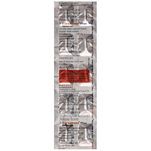 Flexabenz Plus Tablet SR is a combination medicine used to provide relief from muscle spasms, stiffness, and pain associated with musculoskeletal conditions. It generally contains Chlorzoxazone (a muscle relaxant), Diclofenac (a non-steroidal anti-inflammatory drug), and Paracetamol (an analgesic and fever reducer). Together, these ingredients work to reduce pain, relax tense muscles, and relieve swelling or inflammation, making it useful in conditions such as back pain, cervical pain, spondylitis, sprains, strains, arthritis, and sports injuries. The sustained-release (SR) formulation ensures prolonged effectiveness with convenient dosing. Flexabenz Plus Tablet SR improves mobility, reduces discomfort, and helps patients return to daily activities comfortably. It should be taken only under medical supervision and for the duration recommended by the doctor.