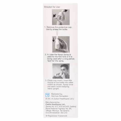 Insert the bottle tip into one nostril, close the other, and spray while breathing gently